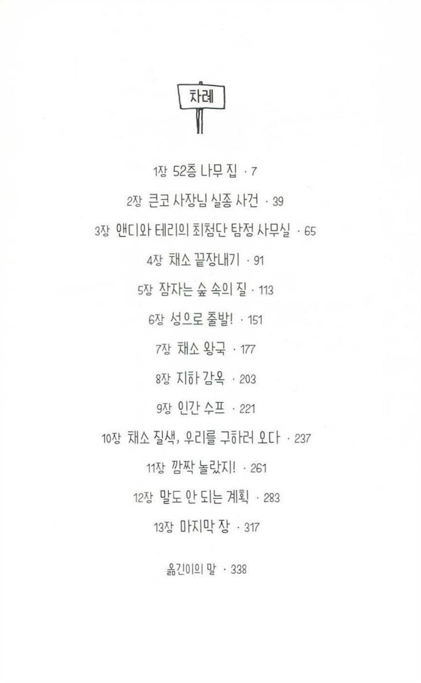 처음 『13층 나무 집』이 소개되고 1년. 나무 집은 어느새 ‘52층’으로 높아졌습니다. 이제 더는 놀라울 게 없을 것 같은데, 『52층 나무 집』에는 거대 헤어드라이어, 만능 변장 기계 5000, 흔들 목마 경마장, 닌자 달팽이 훈련소 등 기발한 것들로 가득 차 있습니다. 그리고 늘 그렇듯이 앤디와 테리가 ‘52층 나무 집’을 즐길 새도 없이 출판사 사장 큰코 씨의 원고 독촉 전화가 걸려 와야 하는데…… 조용합니다. 앤디와 테리는 뭔가 이상하다 느끼고 큰코 출판사로 찾아갑니다. 그런데 큰코 씨가 보이지 않습니다. 앤디와 테리는 ‘큰코 사장님 실종 사건’의 중요 목격자인 애벌레와 바닥에 널브러진 채소 잎사귀 단서를 발견하고 수사에 나섭니다. 과연 두 탐정(?)은 큰코 씨를 찾을 수 있을까요? [나무 집] 시리즈의 독자라면 이미 알겠지만, 앤디와 테리에게 셜록 홈스의 추리를 기대하기는 어렵습니다. ‘명탐정 티미’만큼이라도 해내길 바랄 뿐입니다.