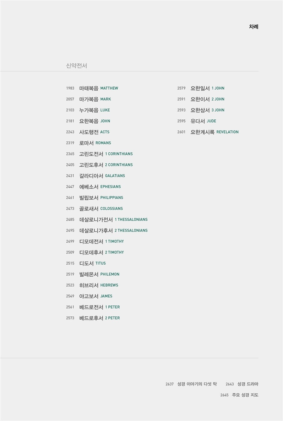 - 성경 통독을 돕는 주요 성경 지도, 성경 이야기의 다섯 막 등 부록 수록