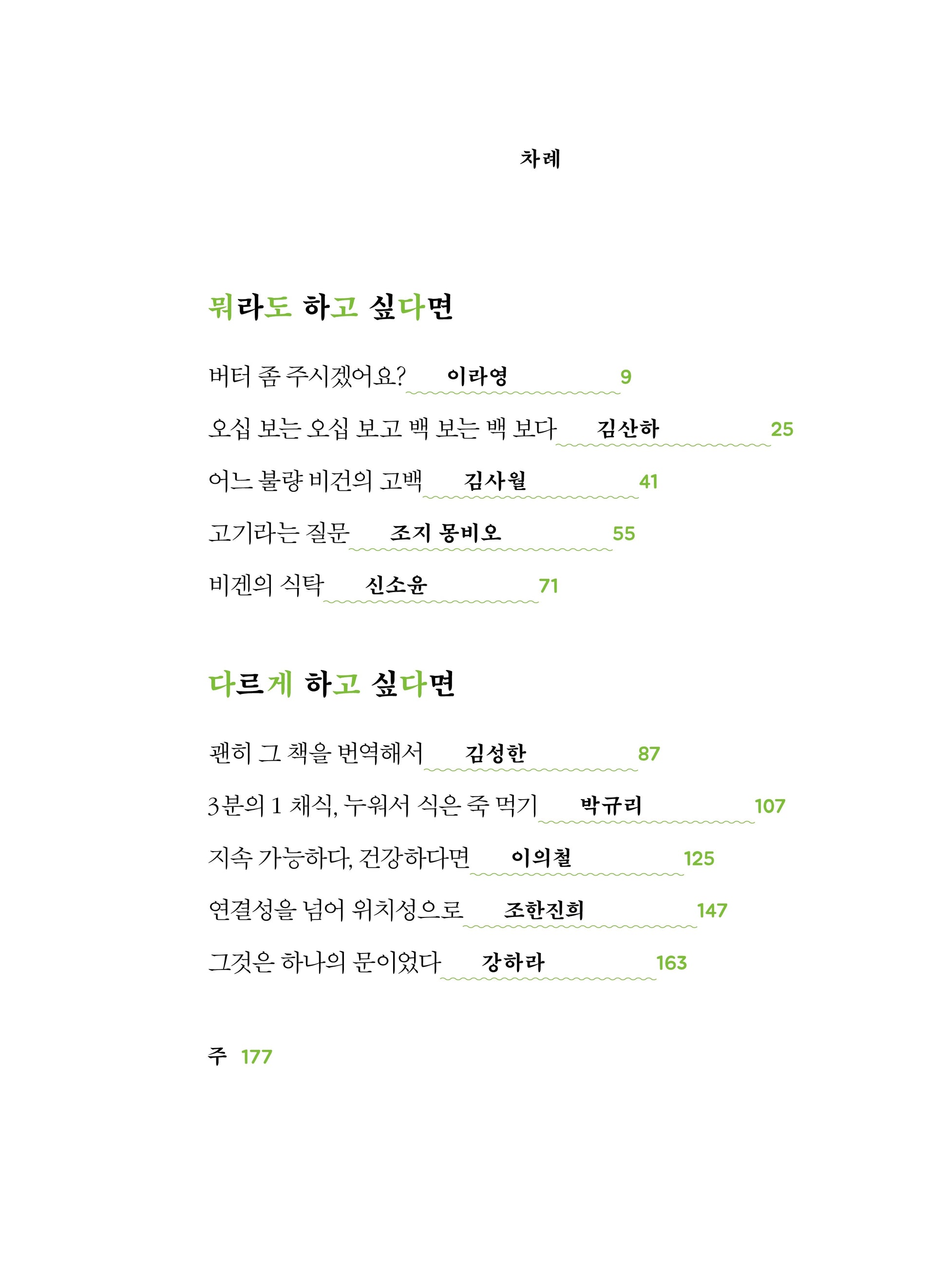 이런저런 이유로 비건에 기웃거리거나 지향하고 있지만, 완벽하지 않아 쑥스럽고, 그렇다고 완벽해질 엄두는 나지 않아 고민인 ‘회색 채식인’들을 위한 가늘고 긴 비거니즘 이야기. 채식을 시도해본 사람이라면 공감할 수밖에 없는 도전과 실패의 기록부터, 불완전한 채식이 어째서 안 하는 것보다는 나은지에 대한 이야기, 그리고 오늘날 비건 열풍을 향한 성찰적 시선까지 서로 다른 분야에서 활동해온 열 명의 작가들이 다양한 각도에서 채식과 채식인을 바라본다. ‘사라지지 않는 것’을 선뜻 말하기 어려워진 위태로운 지구에서, 채식은 변화를 위한 중요한 실마리다. 그렇기에 이 책은 빈틈이 좀 있어도 괜찮다고 말한다. 때때로 제자리여도 멈추지만 않는다면, 그래서 내일이 손톱만큼이라도 나아진다면, 그리고 우리가 그런 미래로 다 같이 걸어갈 수 있다면, 가만히 있느니 뭐라도 해보자고 말이다.