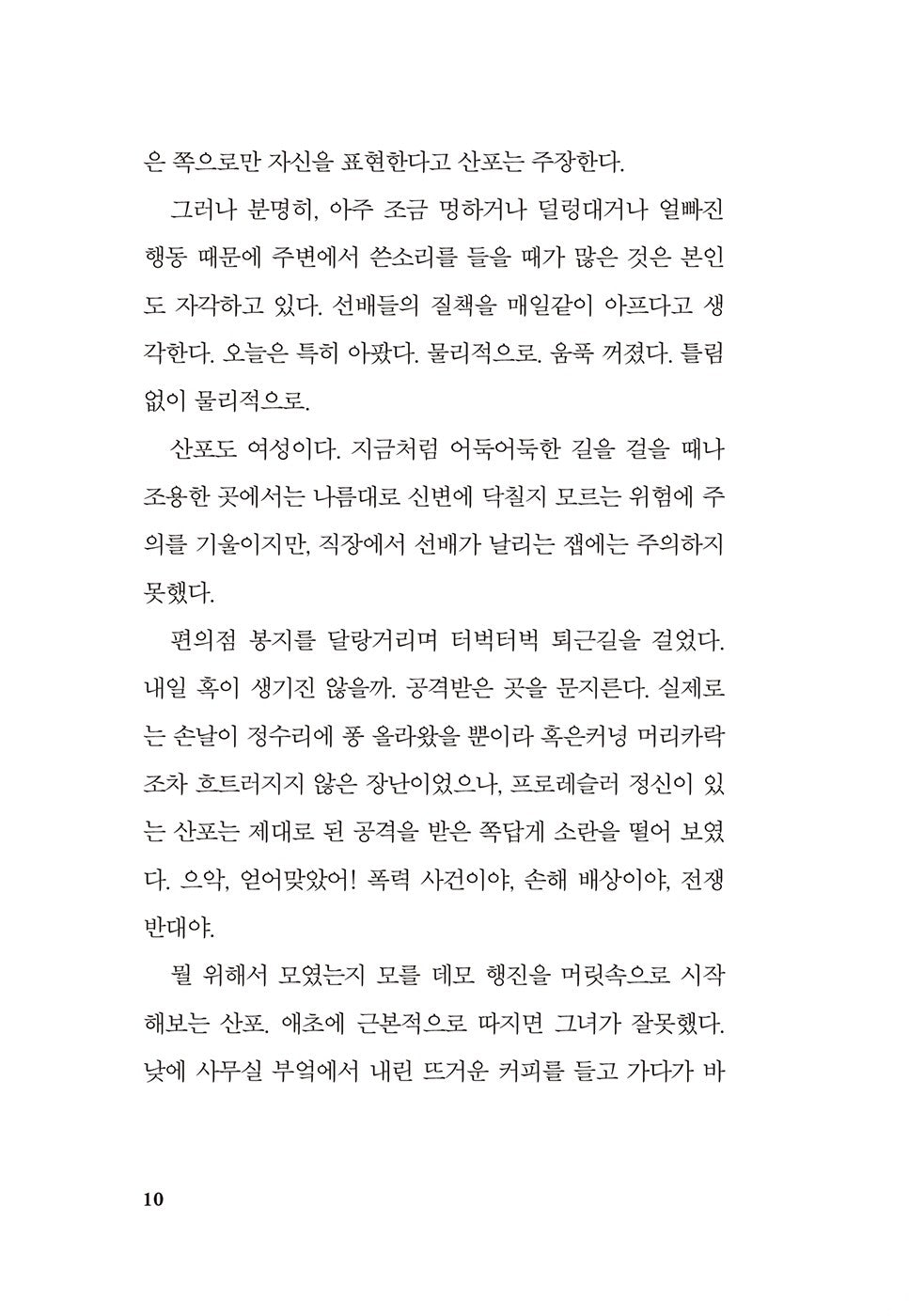 친구의 안 좋은 소식을 듣고 조용히 눈물짓거나, 일터에서 좋아하는 과자를 발견한 것으로 하루 종일 행복해하거나, 이별의 아픔으로 울다가도 애인 없이 보내는 주말의 상쾌함을 느끼는 산포의 매일. 주변에서는 ‘멍하다’, ‘많이 먹는다’, ‘얼빠졌다’ 등의 잔소리를 듣지만 이런 자신의 모습까지 사랑하며 있는 그대로 받아들이는 산포는 ‘산포’ 자신이기에 행복하다. 주말에는 꼭 낮잠을 자거나, 짠 음식을 먹었을 때는 반드시 달달한 디저트를 먹거나, 어떨 땐 과감하게 꾀병을 부리며 출근을 빼먹었음에도 죄책감에 몸부림치는 인간적인 면모까지. 남의 의견에 휘둘리지 않는 대신 스스로에게 취하는 산포의 독특한 행보는 읽으면 읽을수록 독자를 산포의 사랑스러운 매력 속으로 이끈다.