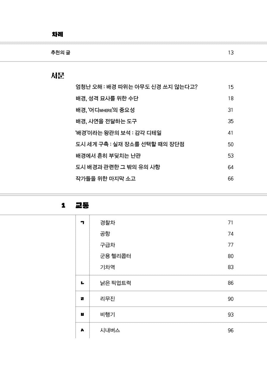배경은 모든 장면에 깊이를 더하는, 스토리텔링에서 빠질 수 없는 요소이며 생각보다 훨씬 많은 일을 한다. 인물을 시험에 빠뜨리고, 과거의 상처를 끌어내고, 글의 분위기를 조성하며, 앞으로 일어날 사건을 암시한다. 꼭 화려하고 특별한 배경을 만들어야 한다는 뜻이 아니다. 『디테일 사전』의 가이드를 따라가다 보면 평범한 배경도 얼마든지 흥미롭게 바뀔 수 있다.
