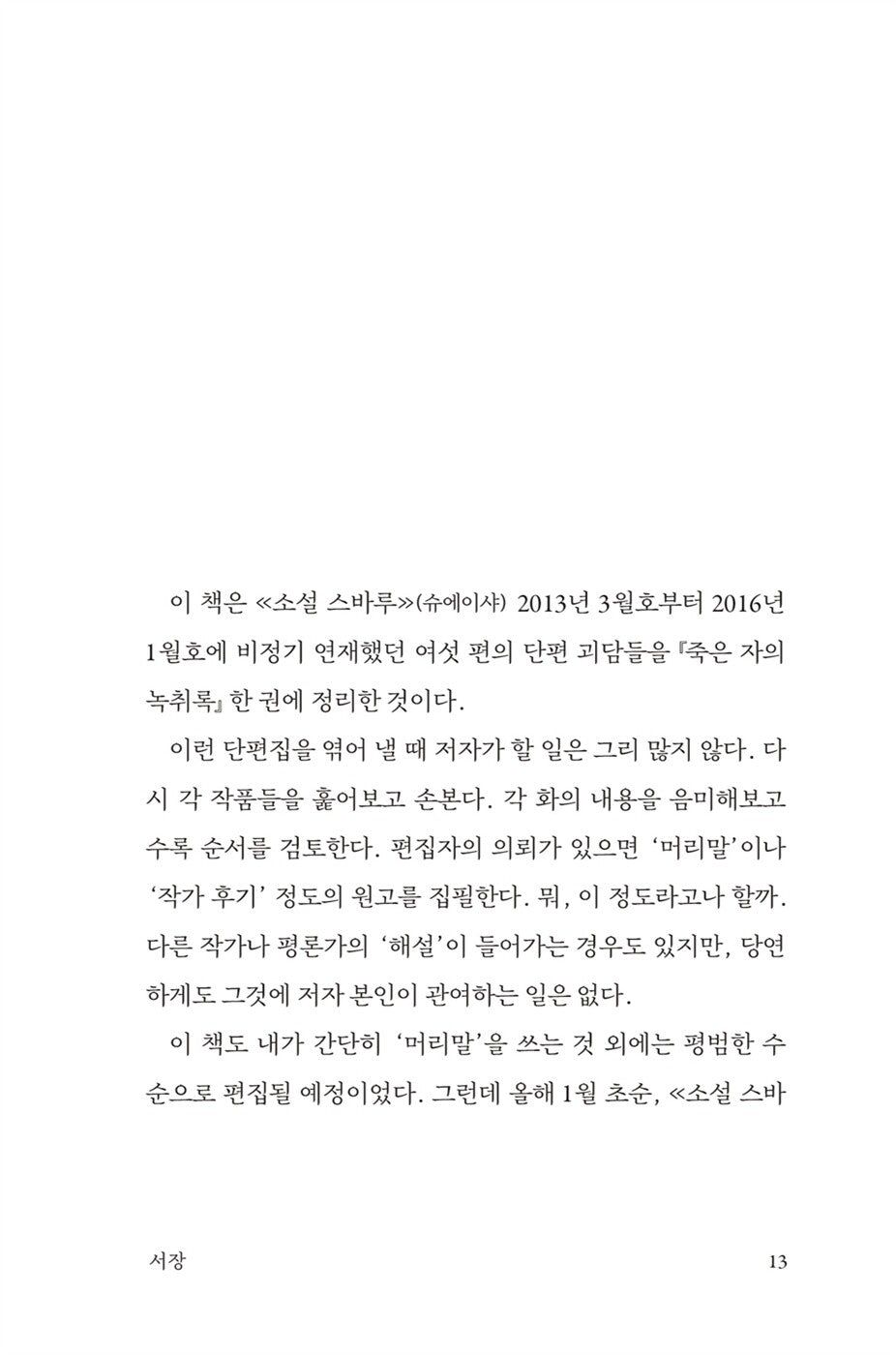 사실과 허구를 넘나드는 메타픽션의 작법 등 독특한 작풍으로 ‘미쓰다 월드’로 불리며 “대체 불가한 하나의 장르”로 일컬어지는 미쓰다 신조의 소설들. 호러와 미스터리 두 장르의 융화에 있어 절묘한 균형을 유지하면서도 작품의 성격이나 주제에 따라 어느 한쪽에 좀 더 무게추를 두기도 하는 미쓰다 신조의 작품군 가운데 《죽은 자의 녹취록》은 추리보다 공포 쪽에 한층 비중을 두고 있다. 여섯 편의 괴담과 망자들이 남긴 마지막 육성에 관한 소름 끼치는 이야기들이 어우러진 이 모골 송연해지는 책은, 그가 쓴 괴담집의 목록에서 가장 첫째 줄에 올라가 있을 대표작 중 하나다.