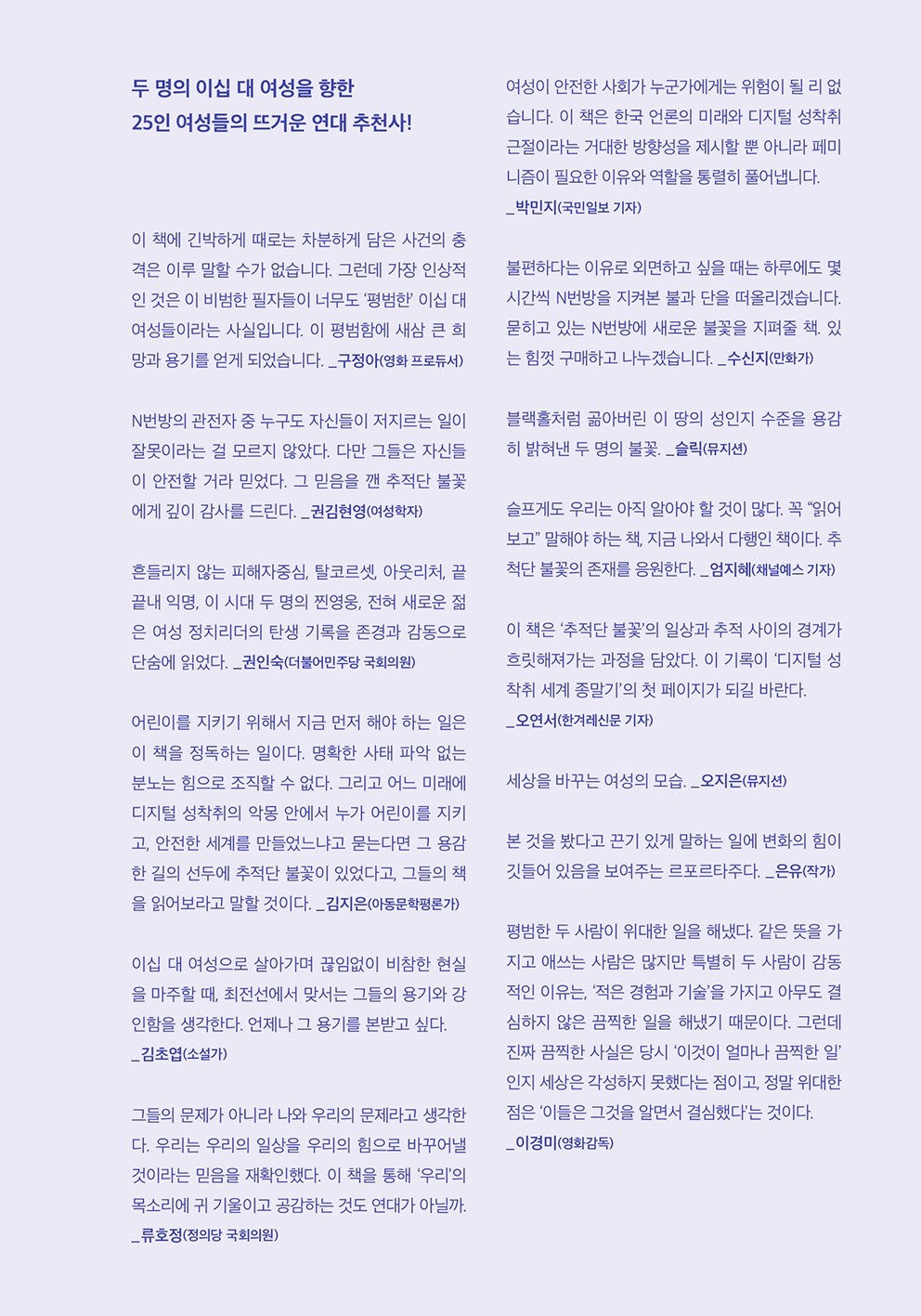 대한민국은 제4차 산업혁명에 발빠르게 준비하며 IT 강국임을 자랑하지만, 디지털 범죄에 있어서, 특히 디지털 성범죄에 취약했다. 대한민국의 국민은 누구인가 되묻게 했다. 피해자에게 사과 한 마디없는 조주빈의 태도가 지금 대한민국의 태도는 아닌가, 전 국민을 분노하게 했던 2020년 3월이었다. ‘이것이 나라냐’라는 여성들의 분노와 지속적인 외침에 9월 15일 대법원 양형위원회가 디지털 성범죄에 대한 권고 형량을 기본 5~9년, 최대 29년 3개월로 정했다. 이런 2020년 너머에는 세상에 텔레그램 N번방의 실체를 밝힌 두 대학생의 노력이 있었다. 바로 ‘추적단 불꽃’의 ‘불’과 ‘단’이다.