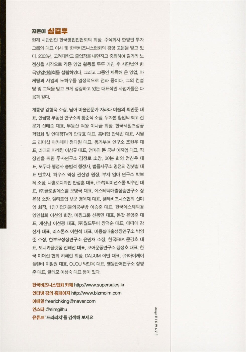 이러한 꿈만 같은 상황은 결코 망상이거나 헛된 희망이 아니다. 그동안 프리리치의 단계를 착실하게 밝아 성공한 이들이 이를 증명한다. 그러니 체계적으로 따라가기만 하면 누구라도 달성할 수 있는 현실 기능의 영역에 있다는 사실을 믿고 행동하라. 『프리리치』 읽고 실행하는 순간 프리리치는 꿈이 아니라 달성 가능한 목표이자 현실이 된다!