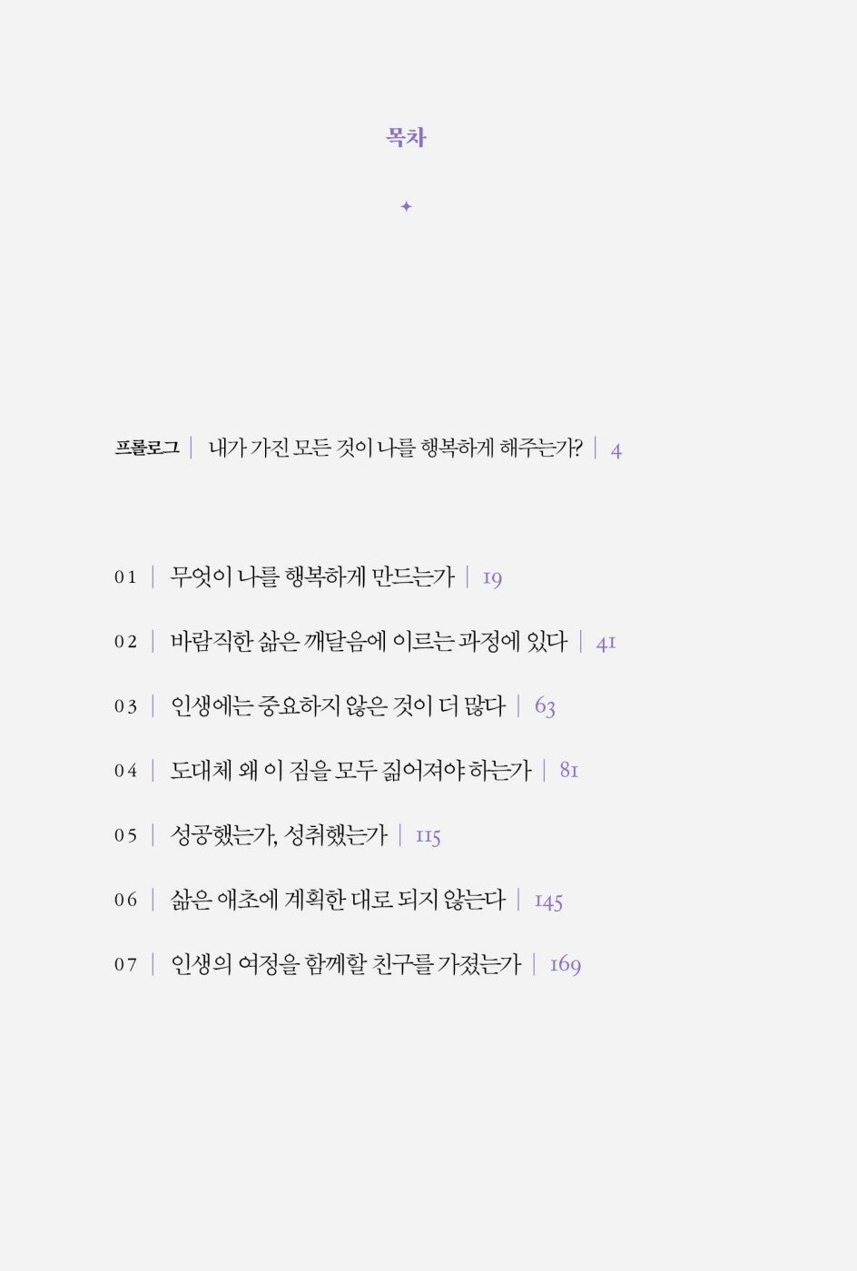 성공보다 성취를, 목적지가 아닌 과정의 중요성을 강조하며, 내면의 통찰력을 통해 더 건강한 선택을 할 수 있도록 도와준다. 바람직한 삶을 위해서 어깨를 짓누르는 인생의 짐을 덜어내고, 과감하게 버리고, 지혜롭게 나만의 인생을 소유하자. 당신은 더 나은 삶을 살 자격이 있다. 마지막까지 나의 삶을 사랑하는 사람으로 살길 바란다.