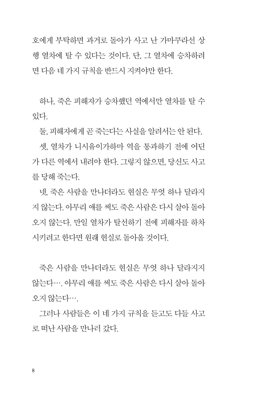 “평범한 아침 인사가 마지막이 될 줄 알았다면 그렇게 보내진 않았을 텐데….” 남겨진 사람과 떠나간 사람 모두가 ‘세상의 마지막 기차역’에서 만나 진정으로 슬픔을 치유하게 되는 가슴 따뜻한 휴먼 판타지 소설.